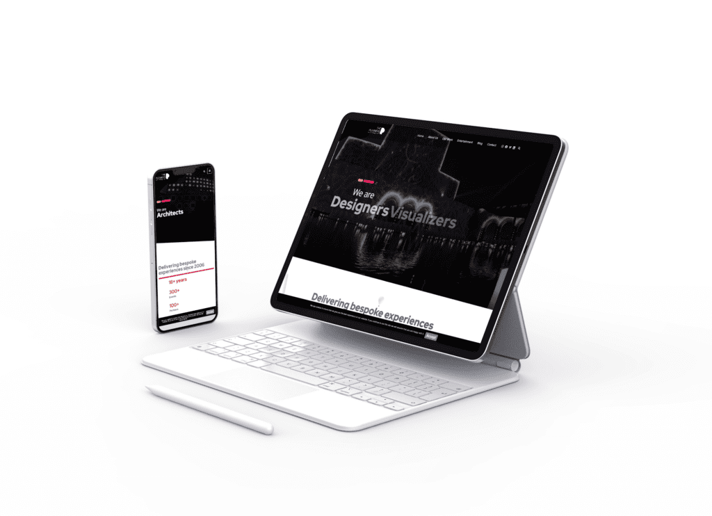 - The Hero Concept: The landing experience immediately establishes authority with the bold declaration “We are Architects,” set against high-impact imagery of luxury events.